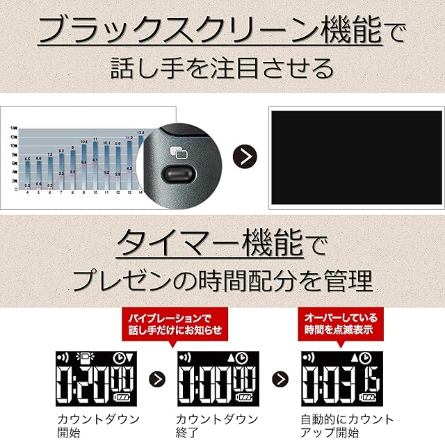 聞き手を注目させる「ブラックスクリーン機能」プレゼンの時間配分に便利な「タイマー機能」搭載