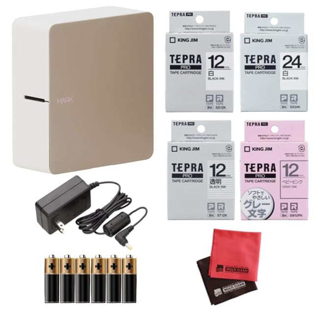 [セット内容]キングジム テプラPRO MARK[マーク] SR-MK1 ベージュ、キングジム テプラPRO テープカートリッジ(透明ラベル 12mm幅 黒文字 ST12K・白ラベル 12mm幅 黒文字 SS12K・白ラベル 24mm幅 黒文字 SS24K・ソフトラベル 12mm幅 グレー文字 ピンク SW12PH)、キングジム テプラPRO用ACアダプター AC1116J、単三電池2本パック 3個(合計6本)、マイクロファイバークロス