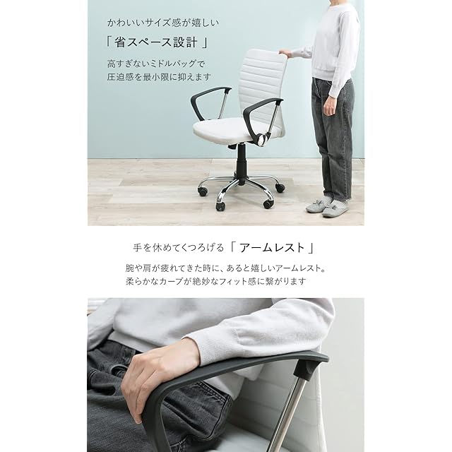 【機能性とデザイン性の両立】:洗練されたモダンなフォルムで置くだけでおしゃれな空間になる、コンパクトオフィスチェア。傾き13度まで揺らせる、ロッキング機能付き。360度回転し、椅子の高さは座面高45~55cmの範囲で無段階調節が可能です。