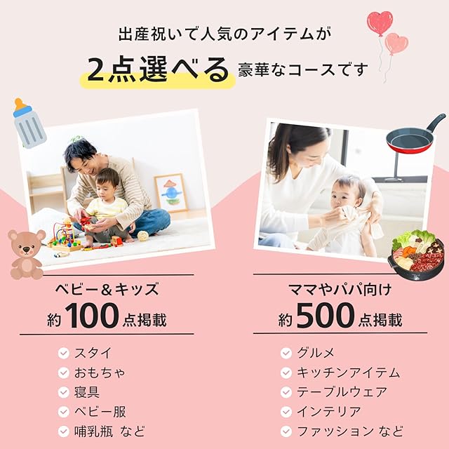 本コースは掲載商品の中から「2点」のアイテムが選べます。たとえばベビーグッズとグルメ、ベビーグッズとママ向けアイテムなど選ぶ楽しさの広がる出産祝いです。