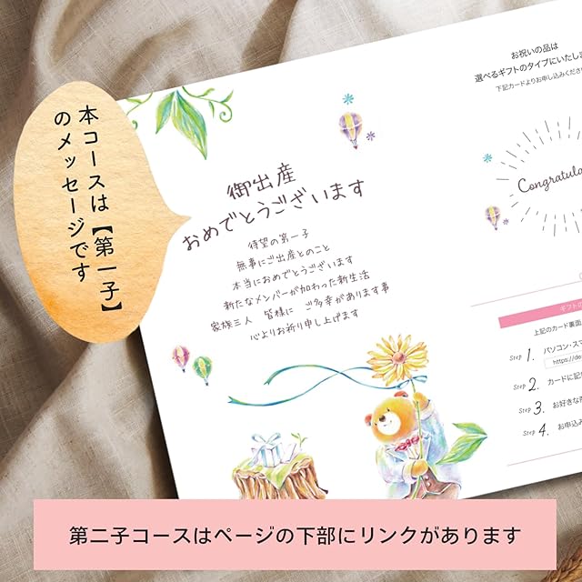 第一子(はじめての出産)誕生のお祝いメッセージと、選べるギフトカードを1枚のレターにしてお届けいたします。