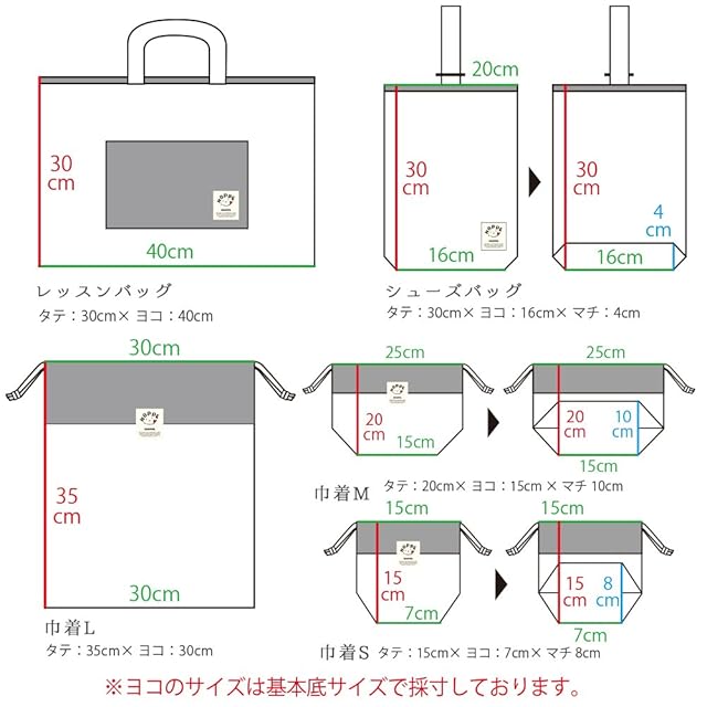 【サイズ】 レッスンバッグ・ 縦30㎝×横40㎝マチなし/ シューズバッグ・縦30cm×横19cm×マチ5cm(開口部24cm)/巾着Lサイズ・縦35cm×横30cmマチなし/巾着Mサイズ・縦20cm×横15cm×マチ10cm(開口部25cm)/巾着Sサイズ・縦15cm×横7cm×マチ8cm(開口部15cm)