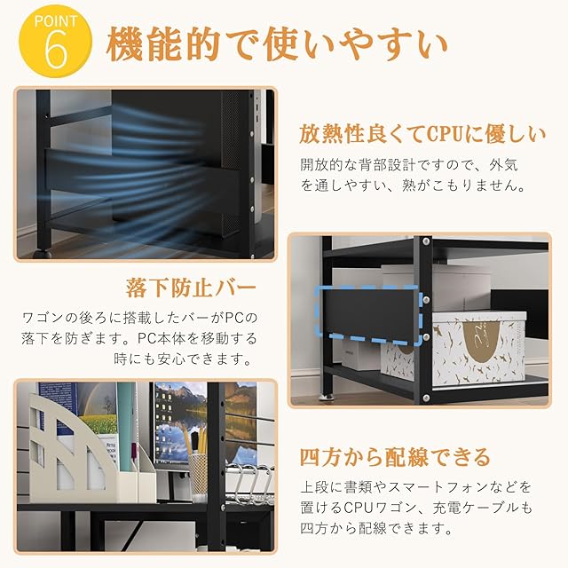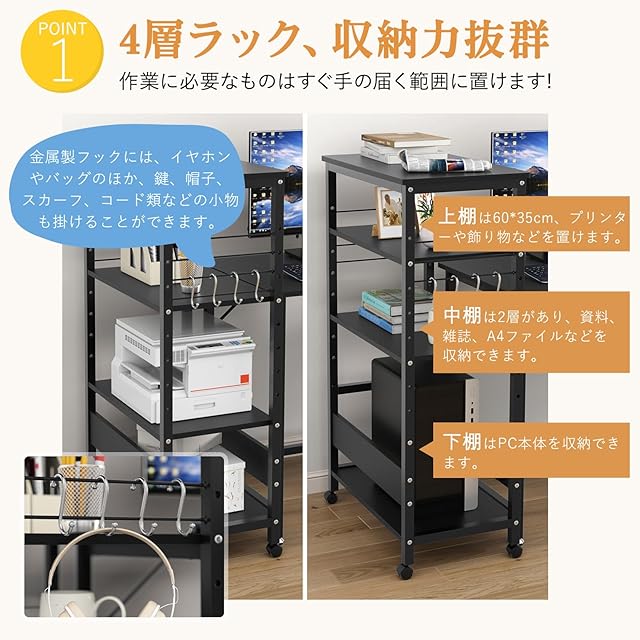 【4層ラック、収納力抜群】上棚は60*35cm、プリンターや飾り物などを置けます。中棚は2層があり、資料、雑誌、A4ファイルなどを収納できます。下棚はPC本体を収納できます;金属製S字フックにイヤホンやバッグなどを掛けることができます。デスクの横に置けば、拡張デスクになります。作業に必要なものはすぐ手の届く範囲に置けます。