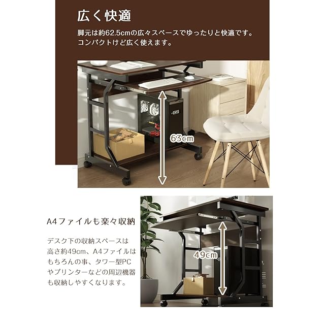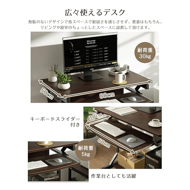 【たっぷり収納できる】★60x30cmキーボードスライダー付き、キーボードを収納でき、高さ9.5cmなので、本やノートPCを置いて作業スペースとしても活用できます。★足元に67*35cmラックに付、ファイルケースやタワー型PCやプリンターなどの周辺機器も収納しやすくなります。