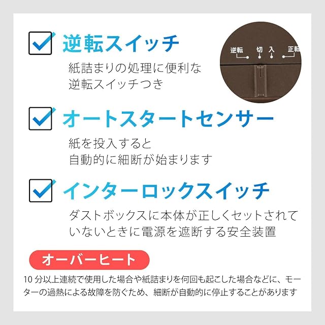 【 仕 様 】 ◆投入口幅:220mm ◆細断サイズ:紙…マイクロカット2×11mm、CD/DVD…5分割、カード…3分割 ◆最大細断枚数:紙…A4コピー用紙(64g/m2)5枚、CD/DVD・カード…1枚 ◆細断速度:約2.0m/分 ◆定格時間:10分/休止時間60分 ◆消費電力:110W ◆定格電流:1.2A