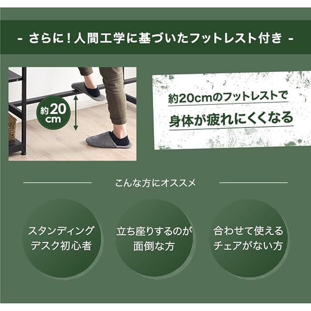 【スタッフのおすすめポイント】・立って作業効率UP!スタンディングデスク ・長時間の作業でも疲れにくい足置き付き ・机周りを整頓できるラック ・使う場所を選ばないシンプルデザイン ・インテリアに合わせて選べる2カラー