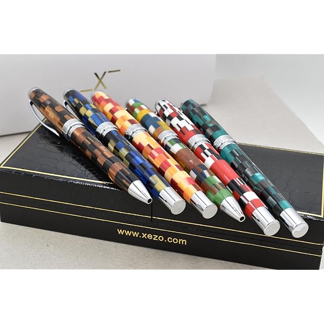 青、緑、琥珀色、茶色、青、白のチェック模様が真鍮製のボディにアクリルをはめ込んでいます。 真鍮製のボディに手作業ではめ込まれたアクリルリング。 各ペンに同じパターンのリングが2つありません。