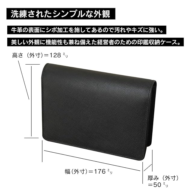 当店のオリジナル印鑑収納ケースが登場! 会社のハンコ(実印・銀行印)を「印鑑ケース」2本+ゴム印を収納することが可能です。 ゴム印は、サイズ:厚み30mm×横幅70mm×高さ70mmまで収納可能です。 本牛革の表面にシボ加工が施してあり、高級感ある印鑑収納ケースです。 洗練されたデザインだから、男女問わずお使いいただけます。 素材には丈夫な本牛革を使用。毎日、持ち運ぶ方でも安心の使い心地です! 印鑑をひとまとめにすることができるので、紛失を防いだり、管理の手間が省けます。 フラップ式なので開閉が楽にできます。 印鑑カードや各種カードの収納も可能です。 デザイン面だけでなく機能性も抜群の収納バッグは、幅広いシーンで大活躍間違いなしです!! 起業のお祝いに・・・高級感のある専用ボックスはギフトにも喜ばれます!