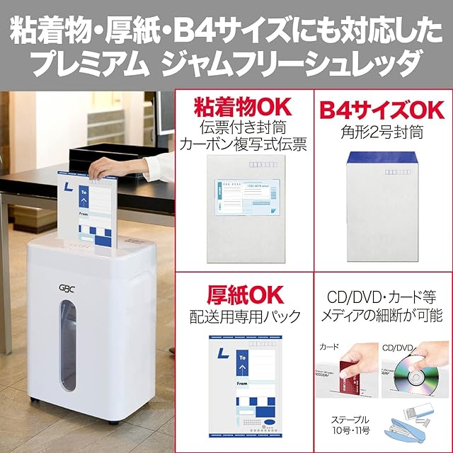GBC シュレッダー 静音 B4サイズ対応 粘着物やラベル付き封筒にも対応 オフィス用 業務用 極小細断 マイクロカット 最大細断枚数13枚 連続使用約15分 CD/DVD/プラスチックカードも細断可能 ホチキス対応 ダストボックス大容量30L A4/約800枚収容 オフィスマイクロカットシュレッダ GSHM3330M-1W ホワイト