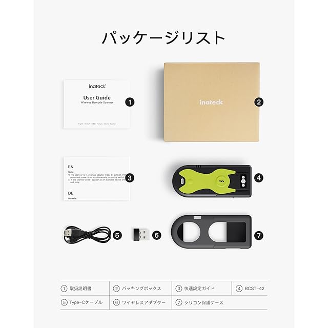 商品名:Inateck 1D 2D QR バーコードリーダー、Bluetooth、無線アダプター、有線接続、日本語説明書付き、日本語バーコードに適用する小型リーダー、技適マーク付き、専用ショートカット、BCST-42