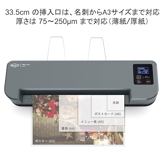 【幅広く対応】335mmの挿入口は、名刺サイズからA3サイズまで対応し、75~250μmの薄紙から厚紙までの標準フィルムを使用可能です。