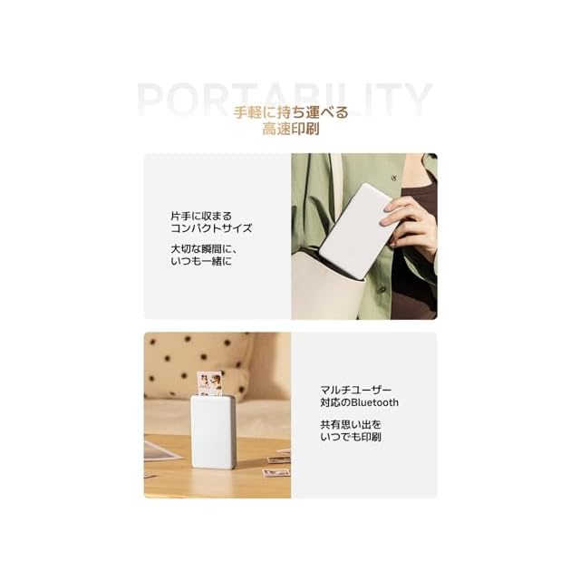 【Bluetoothで共有思い出をいつでも印刷】スマートフォンから直接接続してすぐに印刷。マルチユーザー対応で、大切な人たちとも簡単に楽しさを共有できます。いつでもスピーディーな印刷体験を手軽にお楽しみください。※デバイスを共有すると最大3人まで同時に接続できます。