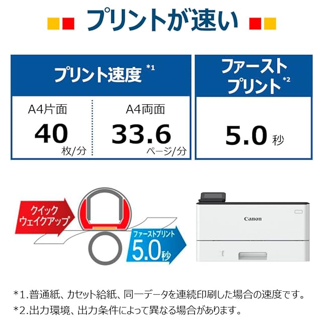 A4モノクロ対応、プリント速度(A4片面)40枚/分、給紙容量(標準350枚・オプション使用時640枚×1段)、インターフェイスUSB2.0・有線LAN・無線LAN、両面印刷