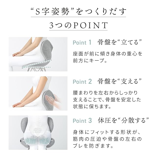 【Point1】骨盤を立てる。座面が前に傾くことで、身体の重心を前方でキープ。骨盤が立つ理想の姿勢へと導きます。
