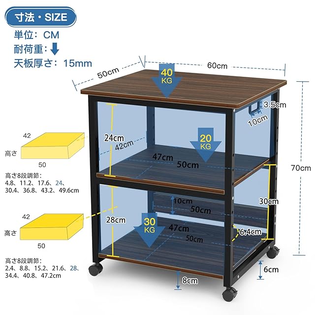 ✅【完成品サイズ】幅60 X奥行50 X高さ70cm(キャスター付き状態)、キャスターを取り外してアジャスターに変更できます。規格はM8です。