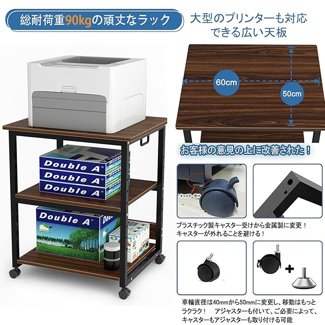 ✅[総耐荷重90kgで支える・幅60×奥行50㎝の広い天板] ★堅牢なスチールフレームを採用した、頑丈な3段プリンタ台です。総耐荷重はなんと90kg!インクジェット複合機や事務用品のストック等、重いものを載せてもしっかり支えます。 ★オフィスで使用する大型のレーザープリンタもOKの広い天板を装備。収納はたっぷりあるので、上段にレーザープリンタ、中段にはコピー用紙や交換用トナーやインクなどの消耗品、下段にインクジェットプリンターやA4ファイルを置いて自由に収納できます。