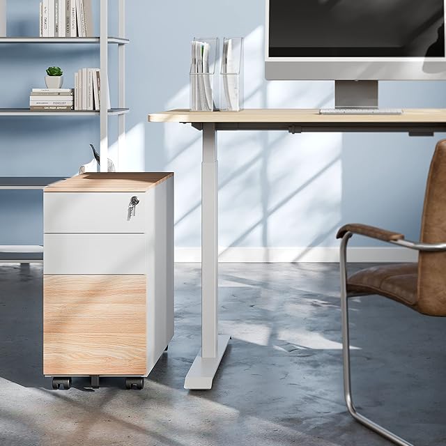 完成品 Fenge デスクワゴン スチール製 オフィスワゴン サイドワゴンキャビネット 袖机 キャスター付き 鍵付き 3段オールロック 大容量 A4対応FC303002WO
