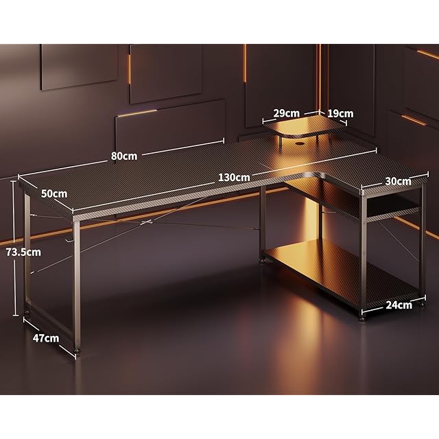 ODK ゲーミングデスク l字 パソコンデスク 幅130 机 デスク desk 棚付き 在宅勤務 pcデスク 桌子 勉強机 L字型 組立簡単 カーボンブラック 右棚