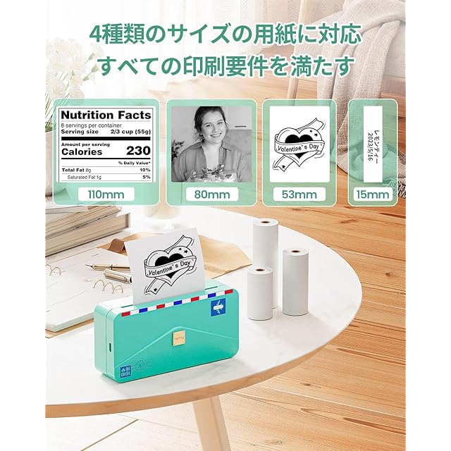ポータブルサーマルプリンター Phomemo M04ASは、かわいい封筒型のスタイリッシュなデザインで、コンパクトで持ち運びに便利です。感熱紙15/53/80/110mmの4サイズに対応。ラベル、写真、メモ、ステッカー、文書などの印刷に最適なマルチ印刷幅です。