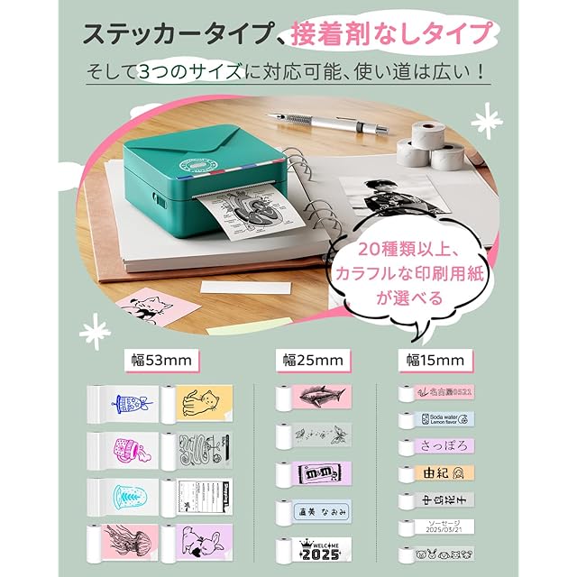 ラベルを印刷できる:M02S ラベルライターは幅15 mm、25 mm、53 mmサイズの感熱ロール紙は互換性があります。グラフィックと写真を印刷できるだけでなく、整理収納に適した25 mmと15 mmのラベルテープも印刷できます。ラベルボックスのテンプレートを使用し、場所や用途に合わせて自由にテンプレートをお選びできます。お洒落かつ 約40種類感熱ロール紙の印刷を楽しめる