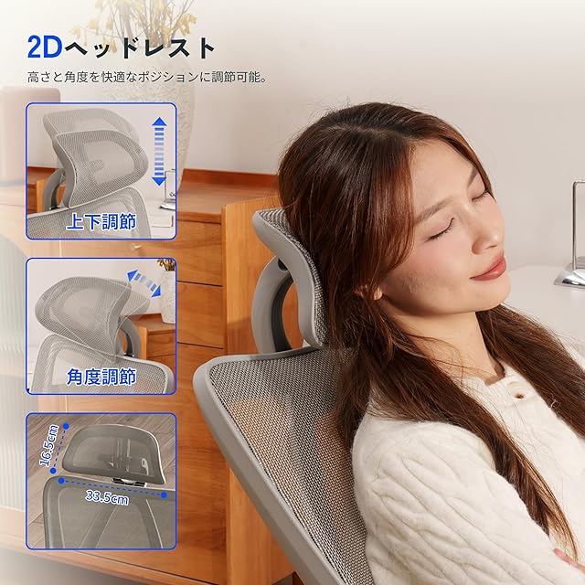 【3Dアームレスト・2Dヘッドレスト】3Dアームレストは上下・前後・水平回転の調節でき、腕を最適な位置で休ませる。2Dヘッドレストは頭の高さや向きに合わせて調整でき、しっかり首を支える。