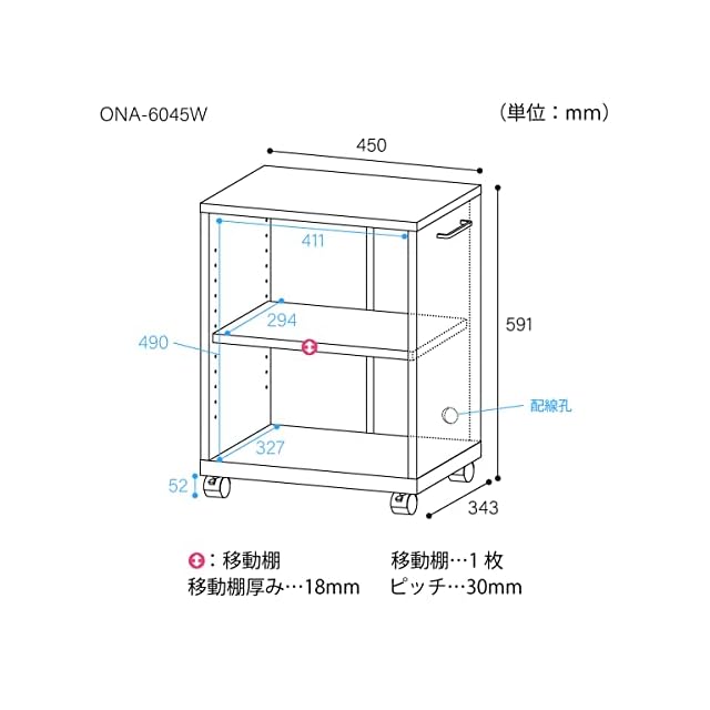 【特長】3cm間隔で高さを調節できる移動棚。移動棚と背板の間には配線用のスキマを用意しました。充電用コード等の配線を後ろに通す配線孔。移動に便利なキャスター付きです。