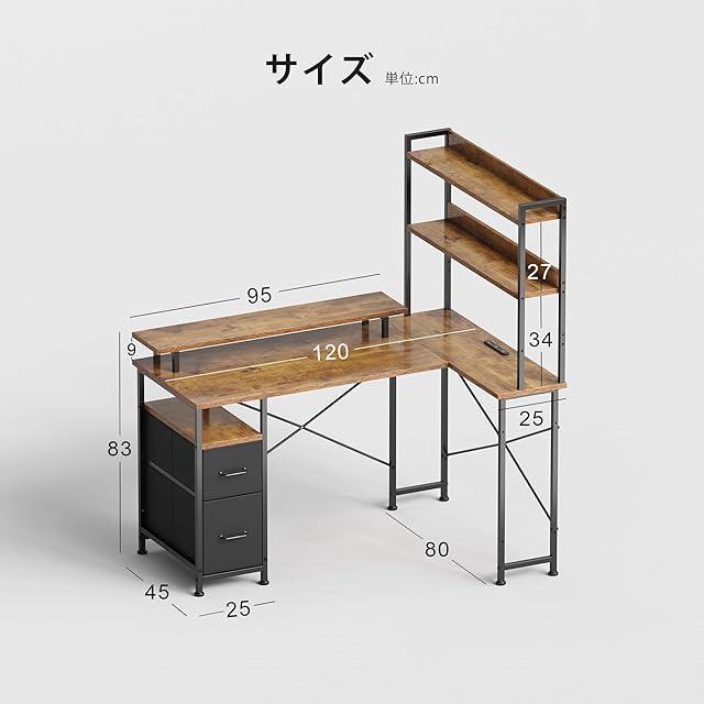 Maihail l字デスク 机 pcデスク desk 桌子 パソコンデスク コンパクト 家具 table 学習机 引き出し付き 上収納棚付き ワークデスク 幅120*奥行80cm ピンテージ