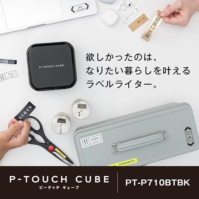 PC・スマートフォンから気軽にラベルを印刷できる、コンパクトなラベルライター「P-TOUCH CUBE」。スマートフォン専用アプリ「P-touch Design&Print 2」を使って、いつでもどこでもラベル作りが始められます。