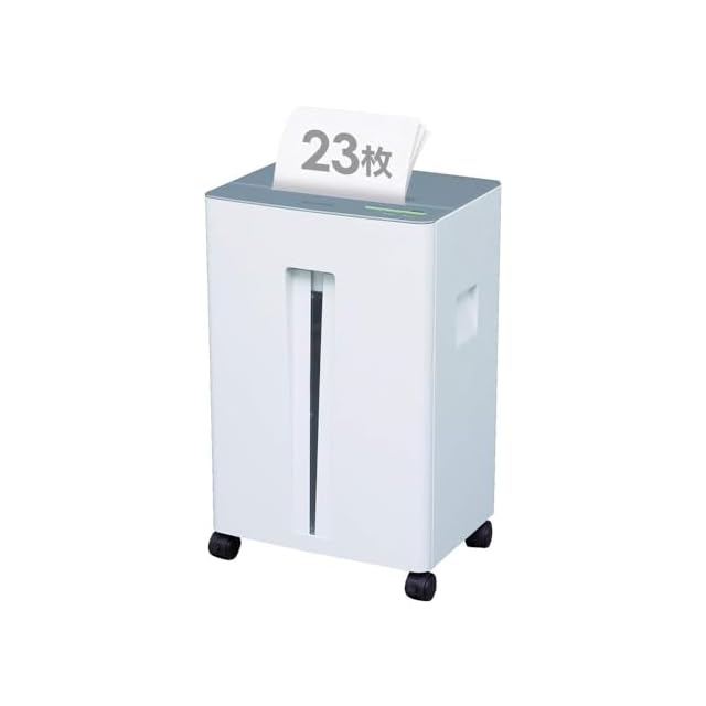 【特徴】オフィスに最適なA4コピー用紙を一度に23枚同時細断できるシュレッダー.一回の投入で最大23枚同時裁断できるので大量の書類を破棄する際にとても便利.移動に便利なキャスター付き.