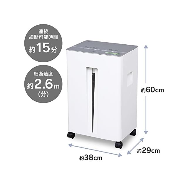 定格時間:20分●定格細断枚数:A4コピー用紙(上質紙 64g/m2)12枚●最大細断枚数:A4コピー用紙(上質紙 64g/m2)15枚