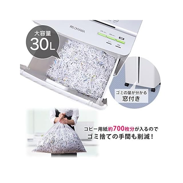 アイリスオーヤマ シュレッダー 業務用 静音 細断枚数23枚 クロスカット 連続使用15分 ホチキス対応 ダストボックス大容量30L A4/700枚収容 OF23 ホワイト/シルバー