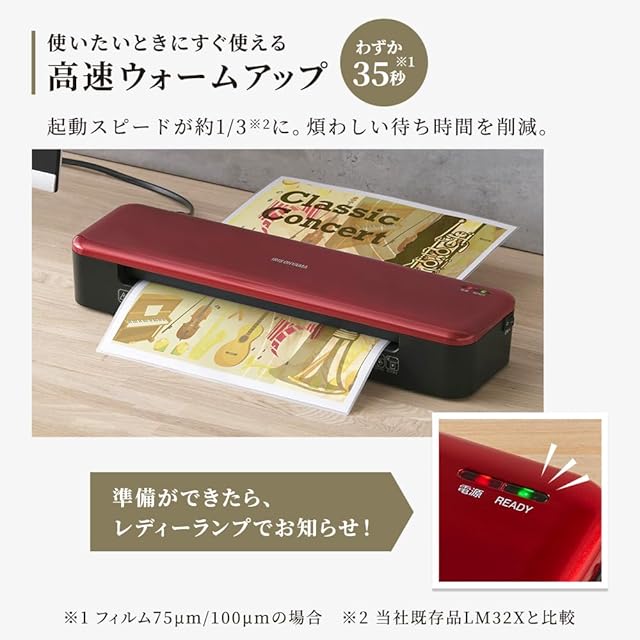 アイリスオーヤマ 高速起動ラミネーター 名刺サイズ~A3 立ち上げ時間35秒 4本ローラー 対応フィルム 75μm~150μm ラミネーター 高速 フッ素加工 よれない コンパクト レッド 赤 KHSL-A342-R