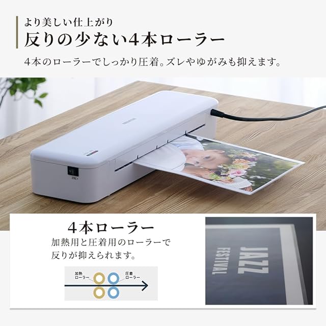 最大ラミネート幅:320mm / 最大ラミネート厚:0.6mm(フィルムと原稿を合わせた厚み) / ラミネート速度:[50Hz]410mm/分[60Hz]500mm/分 / ウォームアップ時間:約35秒(※室温が25℃、75/100μm設定の場合。時間は季節、温度によって数秒前後します。) / 使用フィルム:75μm、100μm、150μm(薄物、厚物)