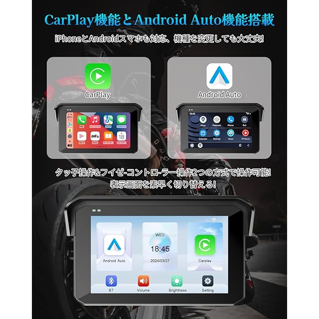 【最新型】バイクスマートモニター 5 インチ【バイク用モニター・Carplay/Android Auto対応・强化アルミ合金ホルダ】IPS液晶タッチスクリーン バイクナビ ワイヤレス スマホ連携 輝度自動調整 IPX65防水防塵 耐熱 耐衝撃性 音声アシスタント/音楽再生/通話/ナビゲーション対応 インカム対応 usbケーブル付き 日本技適取得済み