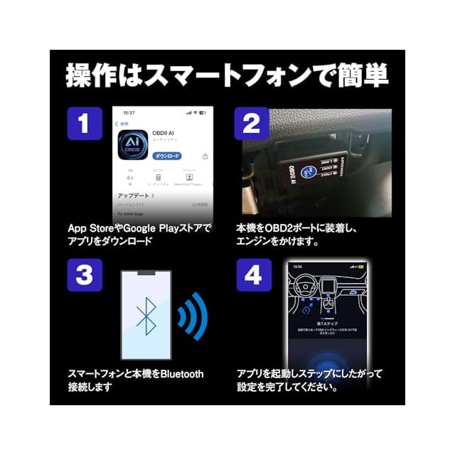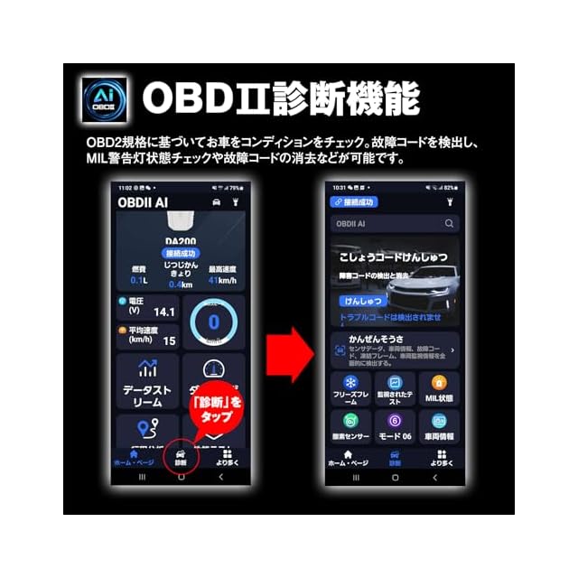 【AI×OBDIIで、車のコンディションをスマホでかんたんにチェック】 本機を設置し、アプリをダウンロードするだけでお車の様々な情報をスマートフォンに表示させることができます。 速度やエンジン回転数、クーラント液温度、電圧などのチェックはもとより、検出された故障コードをAI診断機能で検索・分析が可能です。