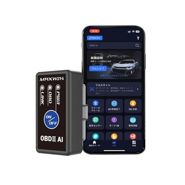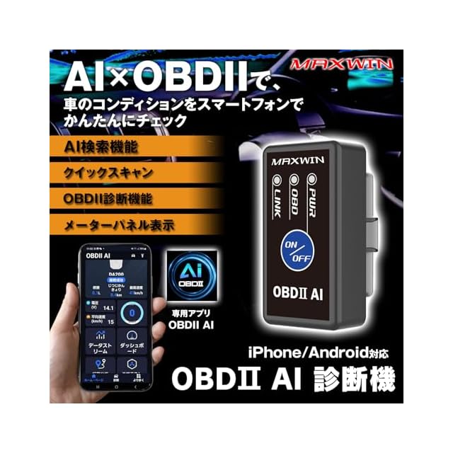 商品名:MAXWIN OBD2診断機 AIアドバイザー アダプター 故障コード消去 スキャンツール 電源ボタン付き 車両検査 故障診断装置 自動車システム監視 サブメーター ワイヤレス Bluetooth4.0/5.4/BLE 専用APP IOS/Android対応 30000以上故障コード 日本語対応 OBD2-EDI01