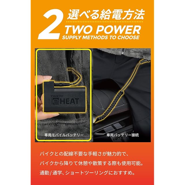 【ご使用に必要なもの】e-HEATご使用時、専用モバイルバッテリー接続の方はe-HEAT 充電器&バッテリーセット(RSP064)、車両バッテリー接続の方はe-HEAT 車両バッテリー接続ケーブルセット(RSP071 / 067)がそれぞれ必要となります。
