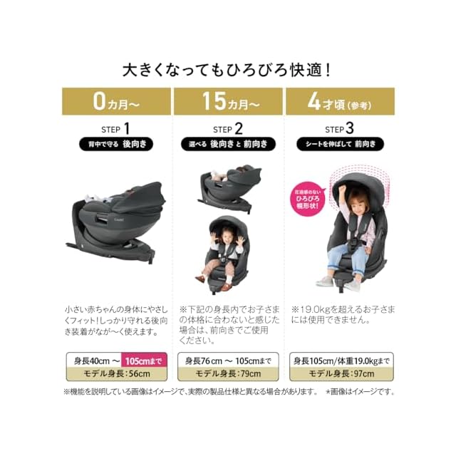 後向き/身長40cm~105cmまで 前向き/身長76cmかつ月齢15カ月以上~105cmまで※体重19.0kgを超えるお子さまには使用できません。(参考:新生児~4才頃)
