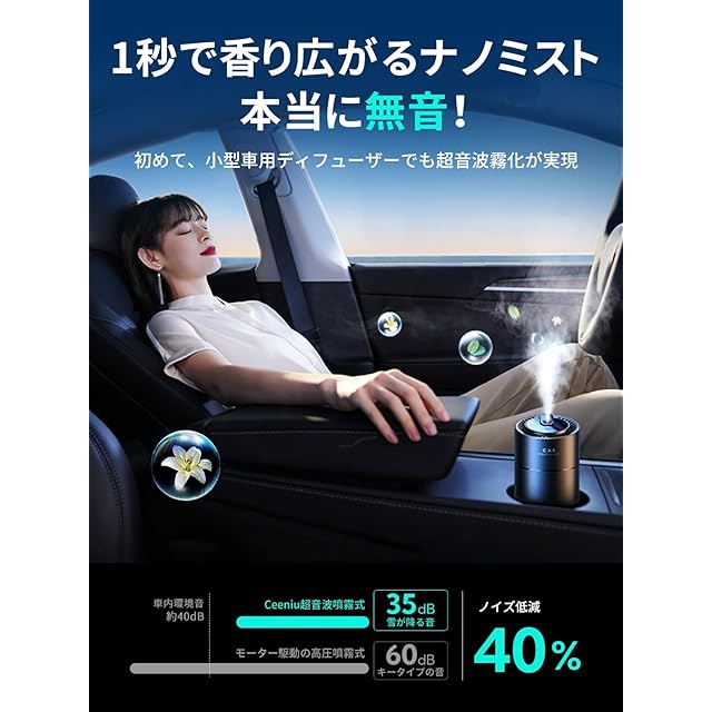 ✅【静音タイプを選ぶ理由①:抜群の静音性】旧型カーディフューザーの騒音にはもう我慢できませんか?超音波霧化技術により、雪が静かに地面に積もるような究極の静けさで微細ミストを発生させ、車内全体を癒しの香りで包み込みます。