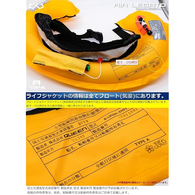 【国土交通省型式承認/桜マーク付き】BASARO 手動膨脹式ライフジャケット(TYPE:A)本製品は、救命胴衣専門メーカーBASAROが企画・製造する、国土交通省型式承認の手動膨脹式ライフジャケットです。国が定める厳格な試験をクリアし、BASAROと日本小型船舶検査機構による出荷前検査を経て、桜マークが押印された状態でお客様にお届けしています。【TYPE:Aについて】TYPE:Aは、すべての航行区域に対応したモデルで、小型船舶に乗船する全ての方に着用が義務付けられているライフジャケットです。渡船業者など、現場のプロも愛用する高い安全性能が特長です。【手動膨脹式モデルの特長】本製品は、環境条件に左右されにくく、初心者から上級者まで幅広い層に支持されている手動膨脹タイプです。※落水時に自動では膨脹しません。PULLタグを強く引くことで膨脹します。