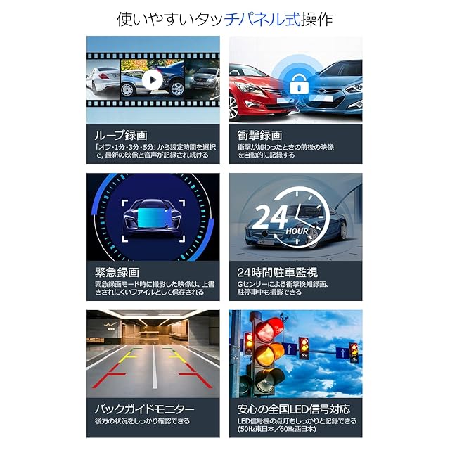 【12インチ大画面 ドライブレコーダー 前後カメラ】視認性と操作性を兼ね備えた12インチの大画面タッチスクリーンを採用しています。この高解像度画面は、明るい日中でも映像を鮮明に映し出し、走行中や駐車時に直感的な確認を可能にします。大画面により、細かいディテールも見逃さず、安全性を向上させます。さらに、タッチ操作でメニューや設定の切り替えも簡単に行えるため、機械操作が苦手な方にも扱いやすい設計となっています。スワイプ操作によって前後カメラの映像を即座に切り替えることができるため、どの場面でもスムーズな対応が可能です。加えて、広角レンズはフロントカメラが170度、リアカメラが120度をカバーし、道路全体や周囲の状況を広範囲に記録します。死角を最小限に抑え、安全で快適なドライブを実現します。