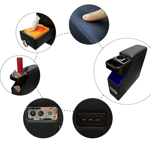 最新型コンソールボックス:1.後部にティッシュ収納ボックスも設置しており、収納スペースを増えます。2.ブルーのLED灯が付き、夜車内が暗い時、小物を探すことに便利になります。車内の灯を開けることが要らなく、運転の安全を確保する。3.シガーソケット(上部:1ポート 前面:2ポート),前席+後席に 5口USBポートを増設、後部座席の乗客にも便利になります。