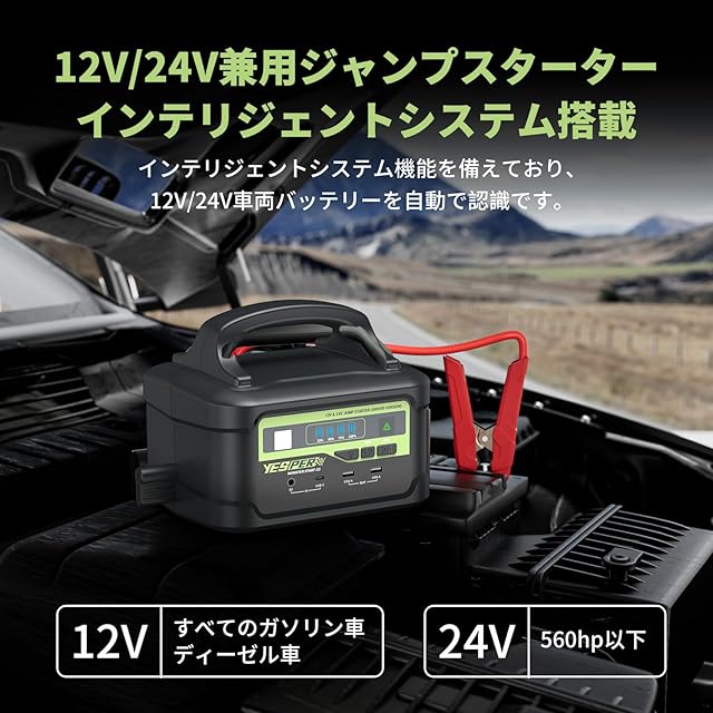 【12V/24V兼用ジャンプスターター 】12Vのすべてのガソリン車とディーゼル車に対応可能。24V車であれば560hpまでの車両バッテリーのジャンプスタートに対応します。さらに、接続した車のバッテリーを本体のセンサーで、12V・24Vを自動で判別し、最適な電圧で出力します。10つの安全保護機能搭載:ショート保護、過電流保護、過充電保護、過熱保護、過放電保護、過電圧保護、極低電力保護、AIソフトウェア保護、逆極性保護、逆電流保護。火花やパチっとなることがなく、安全に使用することが出来ます