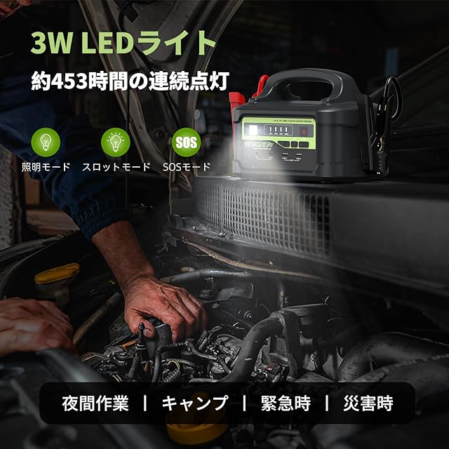 【18ヶ月の期間&PSE認証済み】YESPER ジャンプスターターはすべてPSE認証を取得済です。本品のPSE証明書番号:CTL2207063031-PEC。また、18ヶ月の商品がついています。期間内に不具合品の交換、またはご不明な点がございましたら、お気軽に弊社までお問い合わせください。なお、日本語取扱説明書は、商品の情報の下の商品ガイドとドキュメントに記載されています。または、メールでご連絡いただければ、ファイルをお送りします。パッケージ内容:YESPER大容量ジャンプスターター本体、取扱説明書(日本語)、ジャンプスターターケーブル、専用 AC アダプター、USB-C to USB-Aケーブル