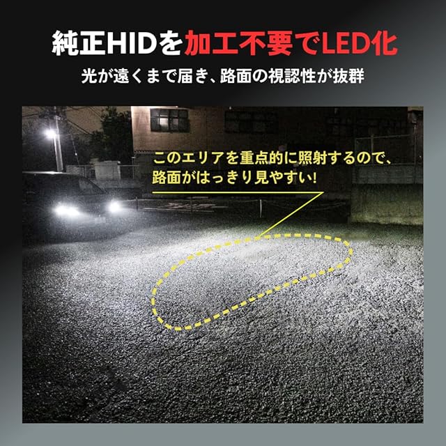 【純正HID比で高い明るさと視認性】 純正HIDの約3.1倍の明るさを誇るDシリーズ。LEDチップが、純正HIDの発光点を忠実に再現し、ムラのない配光で路面を均一に照射します。悪天候や暗い夜道でも、明るく広がる光が安全な視界を確保。「黄色がかった照射」から「クリアなホワイトの照射」への劇的に変化で夜間走行が快適になります。