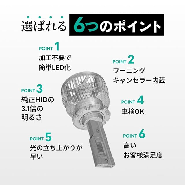 【商品名】LEDヘッドライト Dシリーズ ※車検対応 【色】6500K 【バルブ形式】D1S【明るさ】1灯あたり20,200cd(カンデラ)※数値は車種やレンズ、取付の状態、バルブや測定器の種類によって変動します。※Dシリーズ中1種類のバルブで測定しています。※注意点※車種によっては装着できかねる場合がございますので、ご購入する前にサイズを必ずご確認ください。装着後、サイズが長くて裏蓋が完全に閉まらない場合は裏蓋を切って加工した画像を参考にして頂くかヘッドライトカバーケースもご用意してありますのでご一緒にご検討してみてください。「HID屋のストアを表示」→「オプションパーツ」→ダストカバー。【冷却ファン】36DB静音ファン搭載 【防水防塵】IP68 相当 【消費電力】35W 【電圧】12V車専用 【】2025年3月1日ご注文分より、1年→2年へと変更いたしました。 【商品内容】LEDヘッドライト × 2個 取扱説明書(日本語)【注意点】■輸入車用LEDは98%問題無くて点灯しますが100%ではございません。また車種専用設計ではないため、車両側のシステムの設定やオプションパーツなどにより警告灯が点灯する車種がございます。BMW、MINI等の一部の車両にはコーディングが必要になる場合がございますのであらかじめご了承ください。