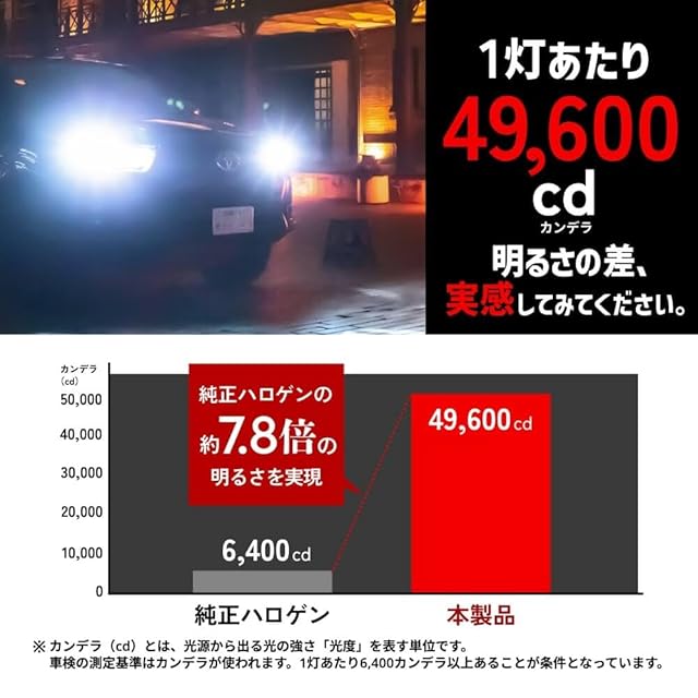 【爆光49,600cd。視界が変わる高光度設計】 1灯あたり49,600cdの強力な光で、純正ハロゲン比 約7.8倍の明るさを実現。従来LEDよりも中心を重点的に照らす配光で、遠くまでしっかり届き、夜間の運転をサポートします。