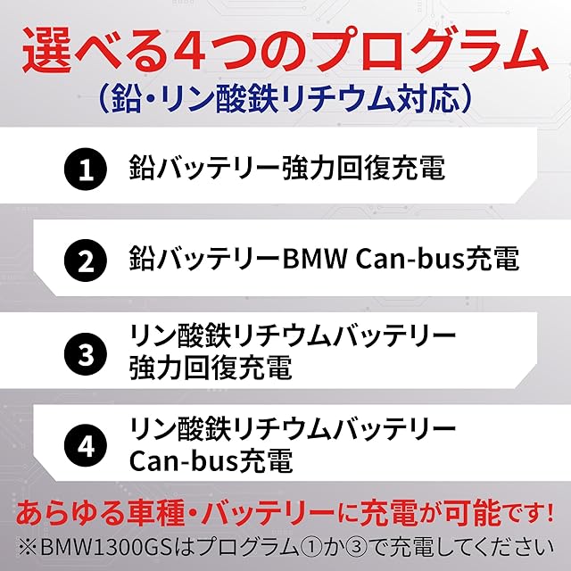 バッテリー回復機能、バッテリー診断機能、ショート防止機能、キャンバス(ヘラーソケット)経由充電機能。