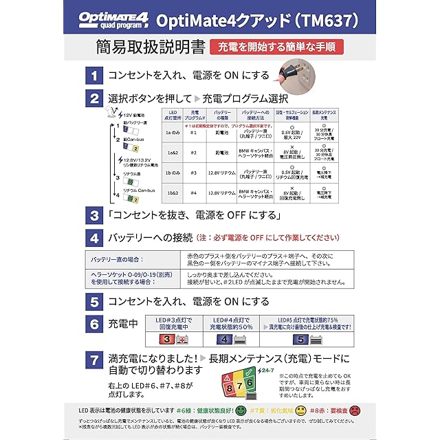 注)完全に寿命を迎えた電池、内部ショートした電池等はオプティメイト充電器で復活する事は出来ませんので予めご了承ください。電池内部でショートが起きた場合は、どんな充電器を使用しても復活出来ません。