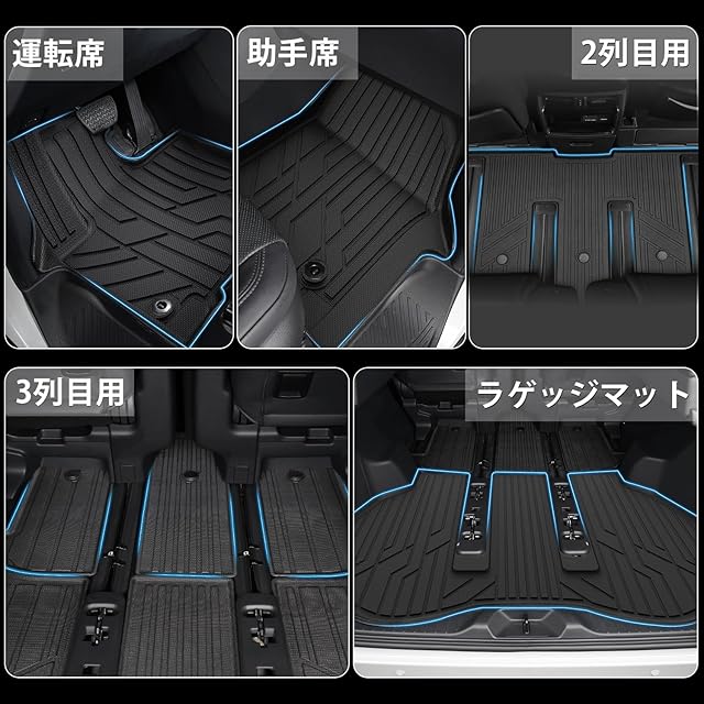 【適合車種】ランドクルーザー250 GDJ250W/TRJ250W型 7人乗り フロアマット 年式:2024年4月~;セット内容:フロアマット×2P、2列目用フロアマット×1P、3列目用フロアマット×1P、ラゲッジマット×1P(合計5PCSセット)。